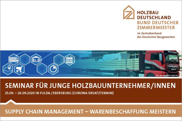 Holzbau Deutschland bietet ein Seminar für junge Holzbauunternehmer/-innen an und zwar von 25. bis 26. September 2020 in Fulda/Ebersburg in der Rhön. Der Schwerpunkttitel heißt "Supply Chain Management - Warenbeschaffung meistern". Die Anmeldung ist bereits möglich.