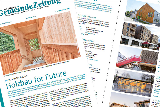 „Mehr Holzbau!“ fordert die Bayerische Staatsregierung in Punkt 9 ihrer Klimaschutzoffensive. Für das Gros öffentlicher Bauvorhaben sind jedoch die Kommunen zuständig. Und die scheuen oft noch vor dem Holzbau zurück. Damit sich das ändert, veröffentlichte die Bayerische GemeindeZeitung in ihrer Ausgabe vom 13. Februar 2020 den Sonderdruck „Holzbau for Future“.